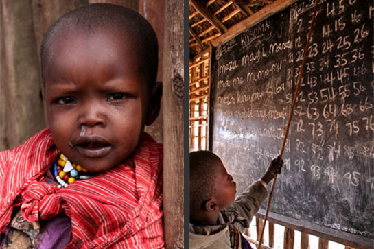 We wringen ons in één van de hutten. De stank van koemest en as komt ons tegemoet. Zes vierkante meter voor een gezin van zes. En nog plaats voor een jong kalf. Zwartgeblakerde muren. Dito dak. Een klein nis in de zoldering werpt wat flauw licht binnen. De heer des huizes geeft ons uitleg over hun leefgewoontes. Over zijn twee vrouwen en drie kinderen. Over de natuurlijke thermos om melk weken te bewaren. We bedanken hem voor zijn gastvrijheid. Eens buiten worden we naar het schooltje geleid. Twintig uitbundige kinderen verwelkomen ons. Het is rekenles. Martine kruipt onmiddellijk in de huid van haar alter ego. Dat van leerkracht. De kinderen dreunen de getallen foutvrij na. Als beloning krijgen ze snoepgoed. Veertig grijpende handjes. Asante.