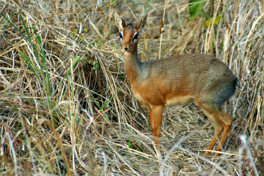 Wat verderop staat een kudde van ongeveer honderd buffels te grazen. We kijken hen recht in de ogen. Met een verrekijker althans. Noodgedwongen moeten we op afstand blijven. Het gebied is enkel toegankelijk voor parkwachters. De rest van de voormiddag bewonderen we de stralende kleuren van de roodgele baardvogel, de sierlijkheid van impala's, de nieuwsgierigheid van de zebra's. We zien een dikdik, met zijn twintig centimeter de kleinste antilope van Afrika. Langs de kant van de weg staat een kudde olifanten te grazen. We stoppen. Er zijn kalfjes bij de groep. Olifanten hebben een vaste trekroute, zegt Emmanuel. Zij wijken hiervan niet af, zeker niet als er kalveren bij de groep zijn.