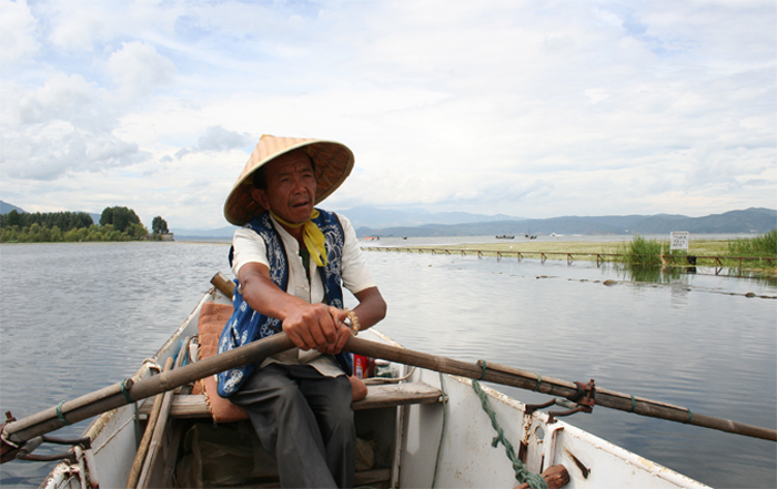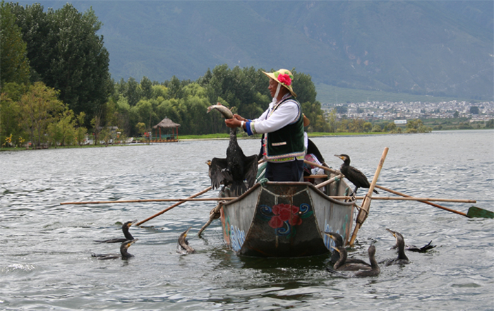 Het Erhaimeer ligt er rustig bij. Boven ons pakken grijze wolken bij mekaar, al kan de zon hier en daar wat zonnestralen door de wolkenmassa priemen. De vissers varen uit om de traditionele visvangst met aalscholvers te demonstreren. Onze gidse probeert me te overtuigen dat de dorpelingen nog steeds met de aalscholvers vissen. Ik vermoed echter dat deze manier van visvangst enkel nog voor het toerisme bestaat.