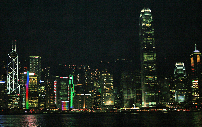 's Avonds keren we er terug. De Star Ferry overbrugt in geen tijd de korte oversteek tussen eiland en vasteland. De frisse zeebries waait de broeierige warmte even weg terwijl meeuwen krijsend boven ons hoofd fladderen. Water en hoogbouw, een overweldigende troef van deze stad. Een ervaring die Hong Kong enkel moet delen met het swingende New York en het groeiende Shanghai. Acht minuten visueel genot. Op de promenade van Victoria Harbour schuift een massa volk heen en weer. Langs de waterkant makt de wijk Tsim Sha Tsui zich op het spiegelbeeld van Hong Kong Island te worden, met nieuwe hoogbouw in bamboestellingen. De skyline van Hong Kong Island oogt geweldig, één van de mooiste stadsbeelden ter wereld. We zien een façade van staal, glas en neon. De lichten van het Bank of China- en HSBC-gebouw en van de vele andere wolkenkrabbers flitsen aan en uit. We zijn op de Avenue of the Starsen kijken naar de als groots aangekondigde Symphony of Lights. De lichtshow is knap, de lasershow pover. We haasten ons met de metro terug naar Hong Kong Island, waar een tafeltje in de bar op de negenveertigste verdieping van ons hotel op ons wacht. De gerechten zijn verrukkelijk, de wijnen voortreffelijk. Voldaan vallen we in slaap.