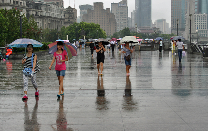 Het regent pijpenstelen als de Airbus van Eastern China grond raakt in Pu Dong Airport, de luchthaven van Shanghai. De hele oostkust van China wordt reeds enkele weken geteisterd door hevige regen. We ontspringen de dans deze keer niet. Onder felle regen lopen we naar de ferryterminal, aan de statige Bund.